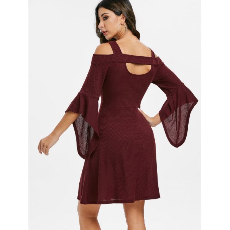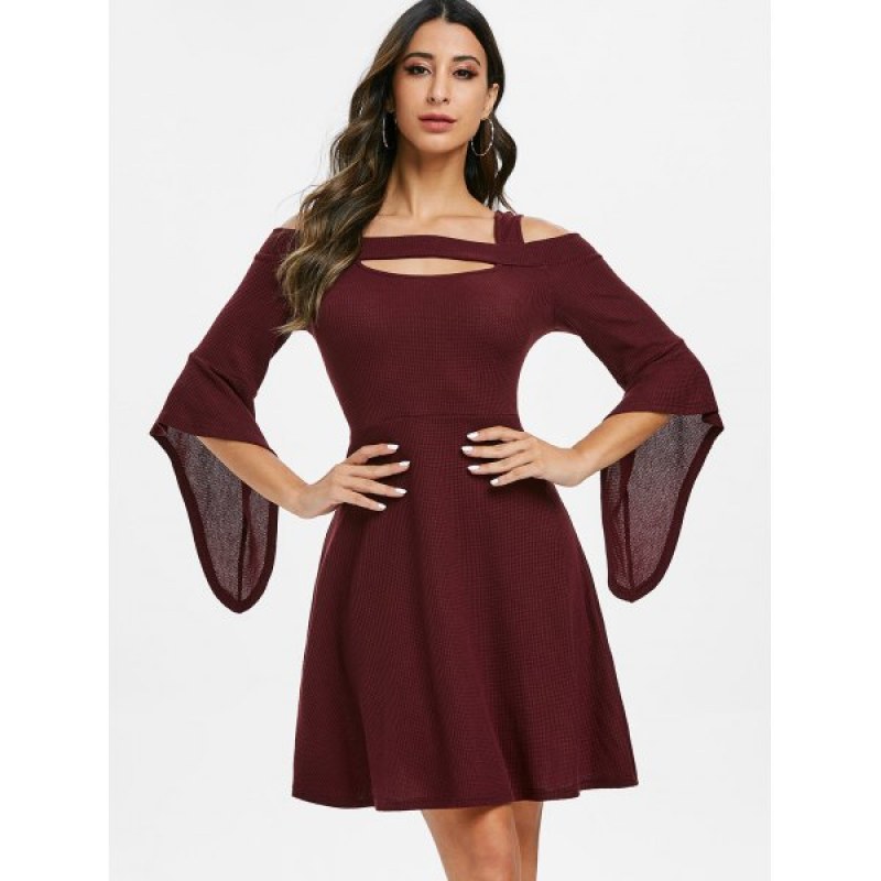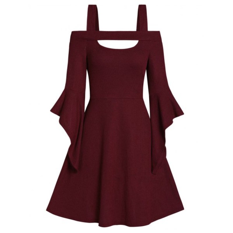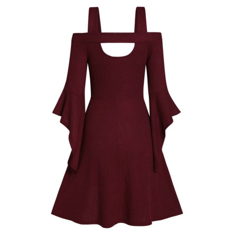 Square Collar Solid Open Shoulder Fit And Flare Dress - Red Wine