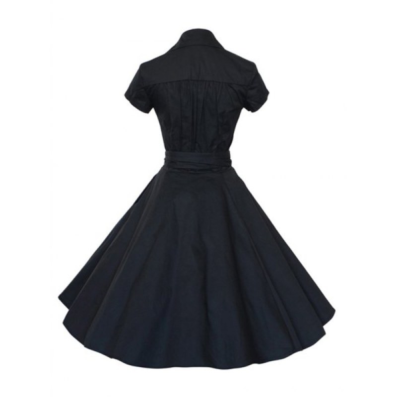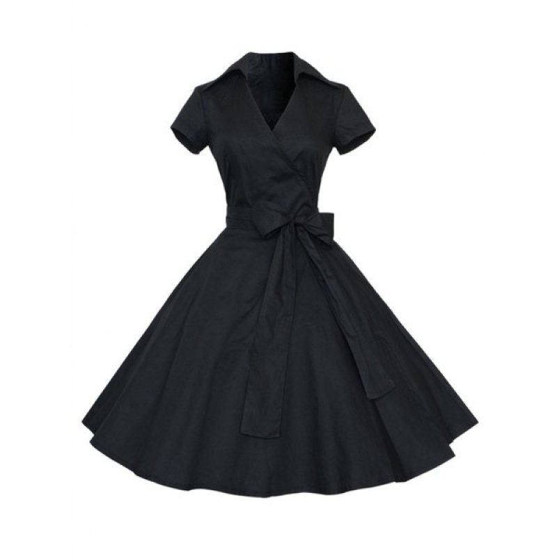 Hepburn Vintage Series Women Dress Spring And Summer Pure Color Lapel V-neck Design Short Sleeve Retro Belt Dress - Black