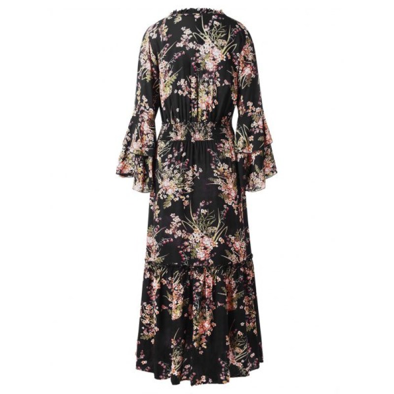 High Waist Tiny Floral Flounce Trim Dress - Black