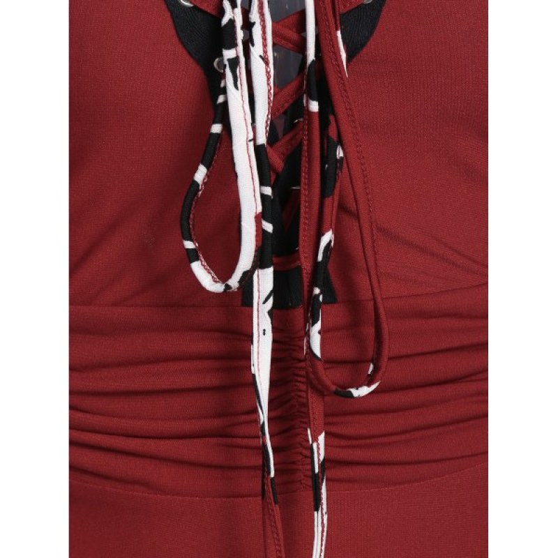 Spaghetti Strap Ditsy Print Ruched Dress - Red Wine