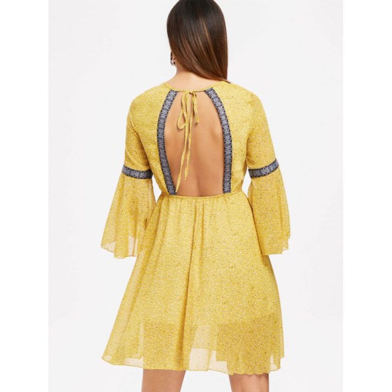 This casual holiday dress features full of print. ethnic style band to panel. keyhole neck with lace-up closure at the back. and cut out back design to show a sexy back. A-line swing hemline. Lightsome chiffon fabric with a lining.