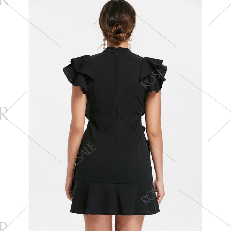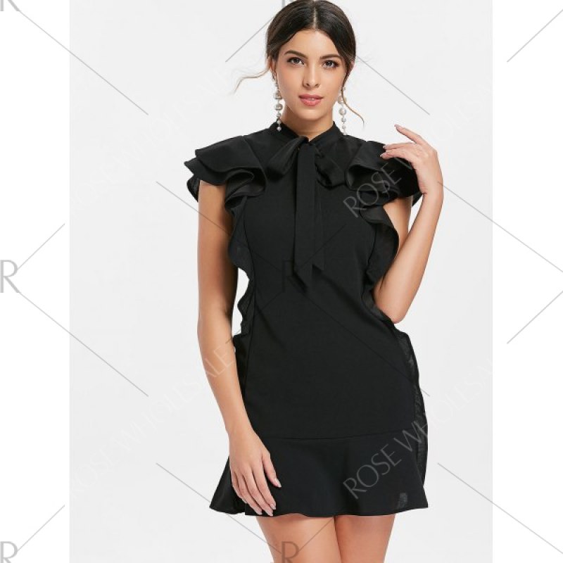 Bow Neck Ruffle Mini Dress - Black