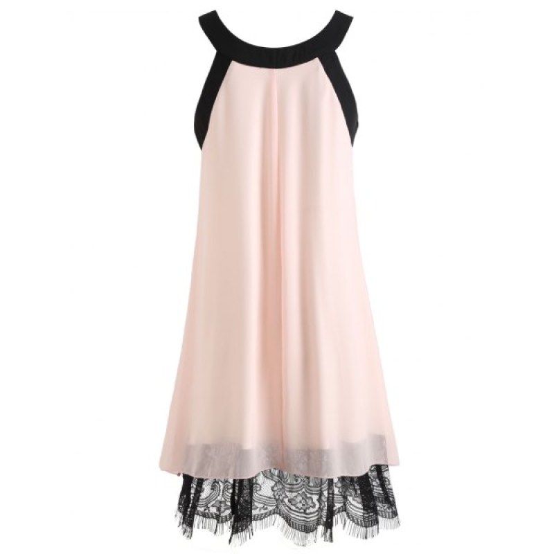 This simple dress features the black tone to put along the brim and paint an arrow pattern on the chest to make a difference. and the double-deck design of chiffon outer fabric and stretchy fabric lining with eyelash lace brim. Loose silhouette. Swing style.