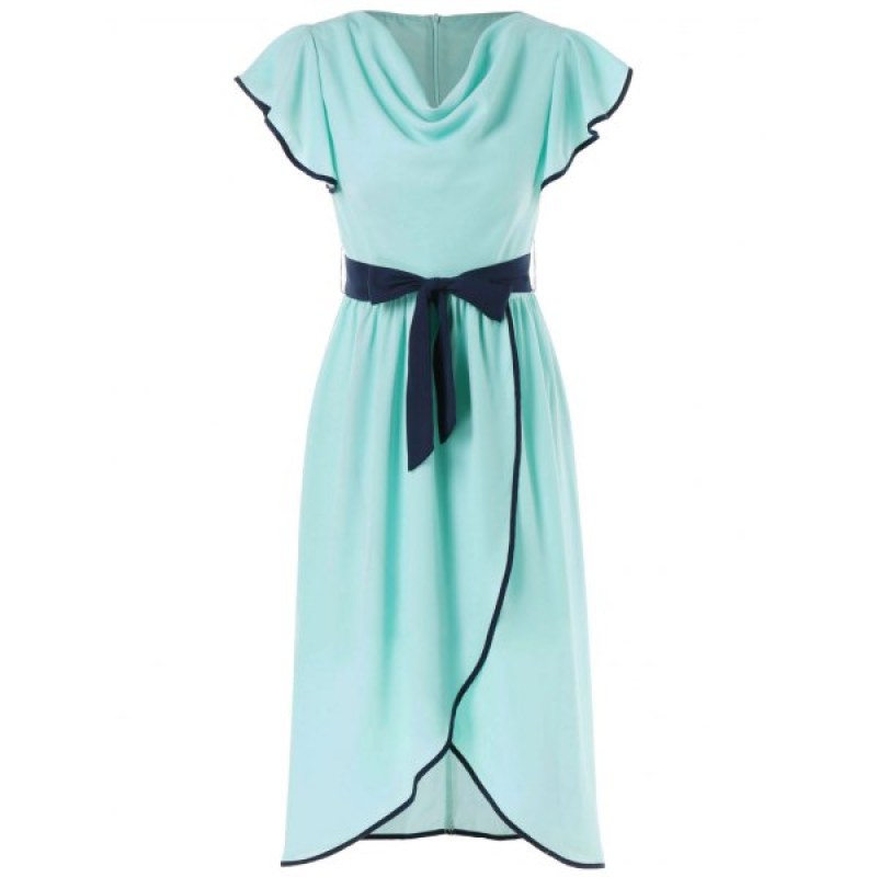 A tulip cut front. the heaps collar. the color trim. and a high waistline with a removable sash make this modish chiffon dress a fresh pick for any occasion. No stretchy. Hidden zip-back closure.