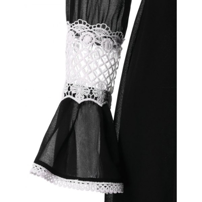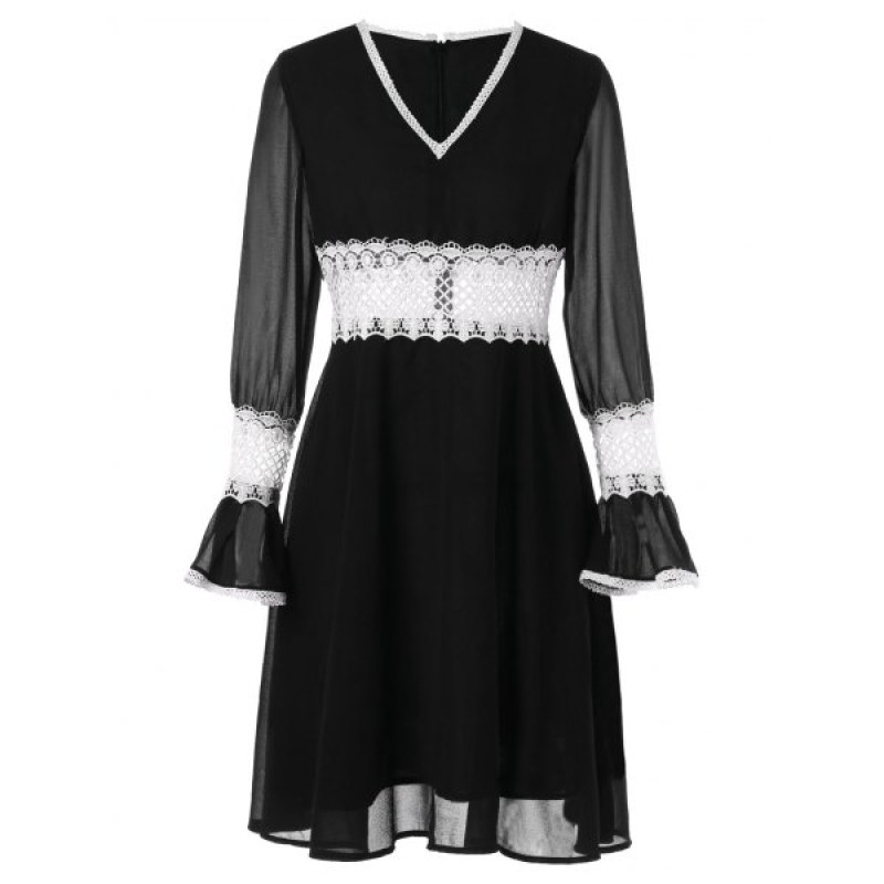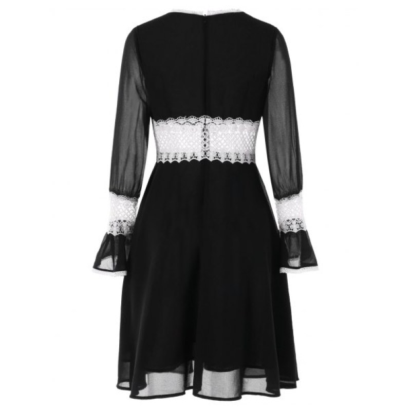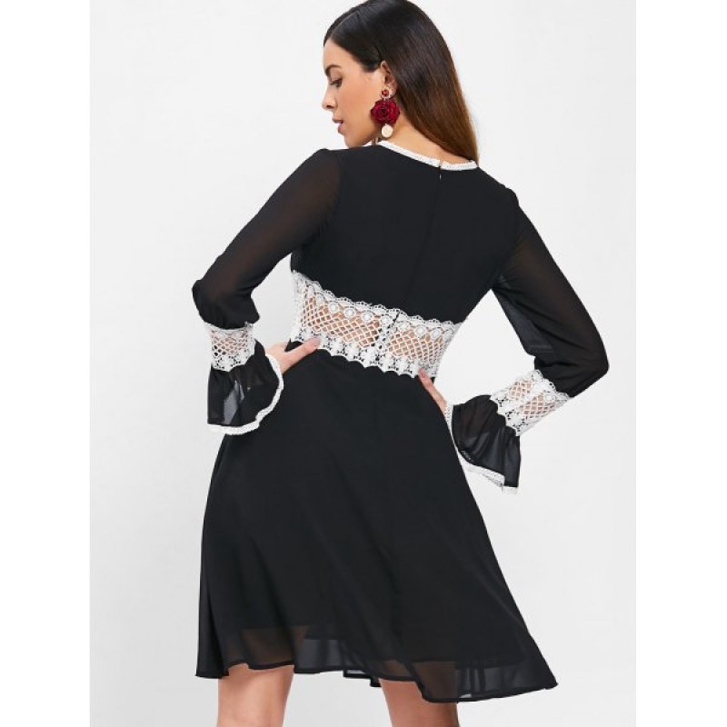 Contrast Lace Insert Chiffon Dress - Black