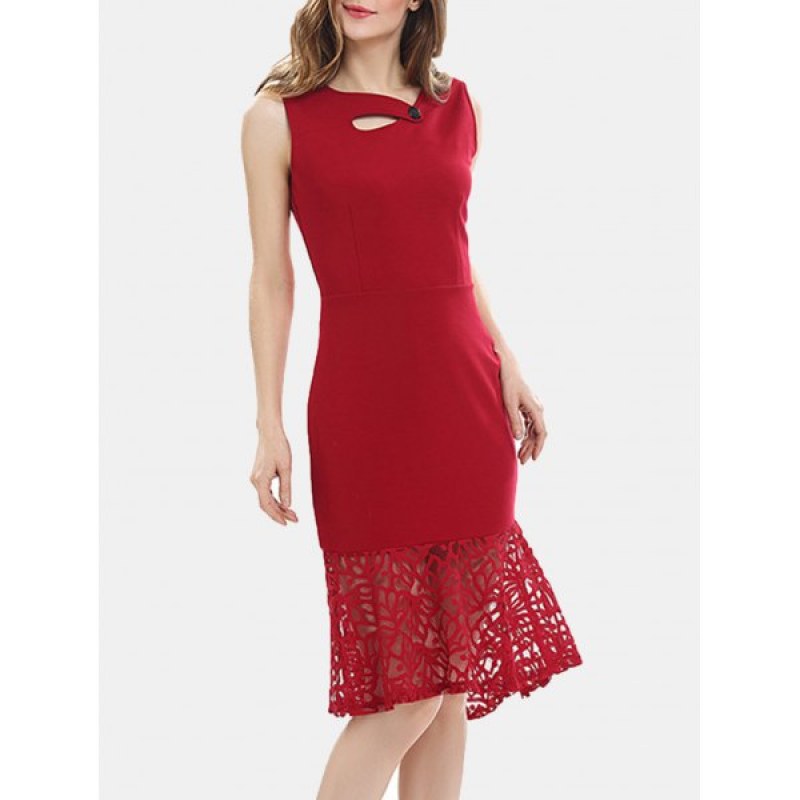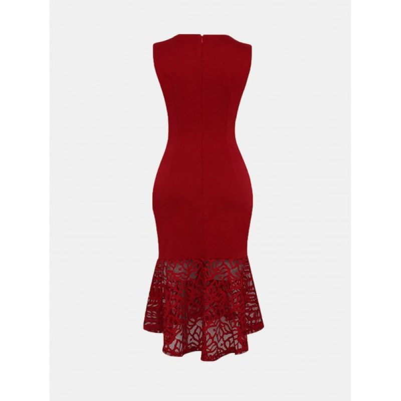 Women Irregular Necklines And Sleeveless Lace Slim Dress - Lava Red