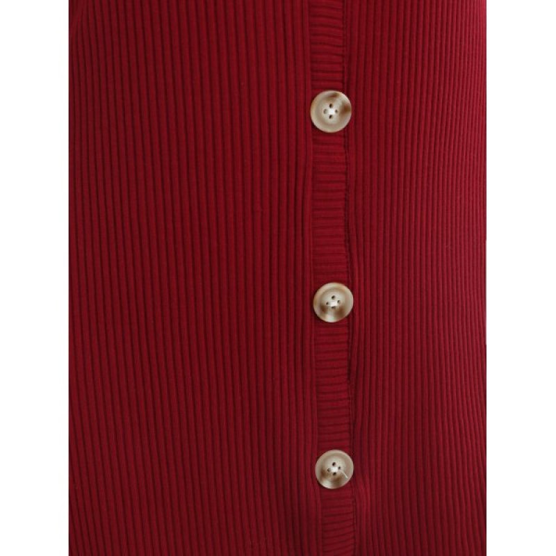Ribbed Knitted Dress with Buttons - Red Wine