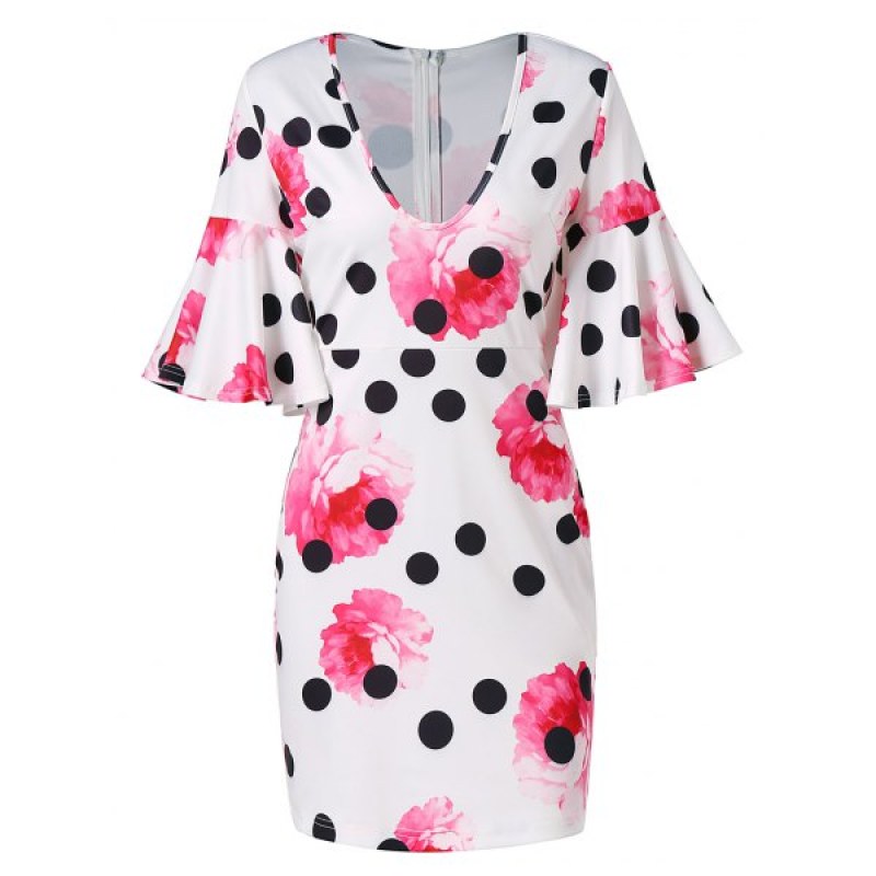 Floral Polka Dot U Neck Skinny Dress - White