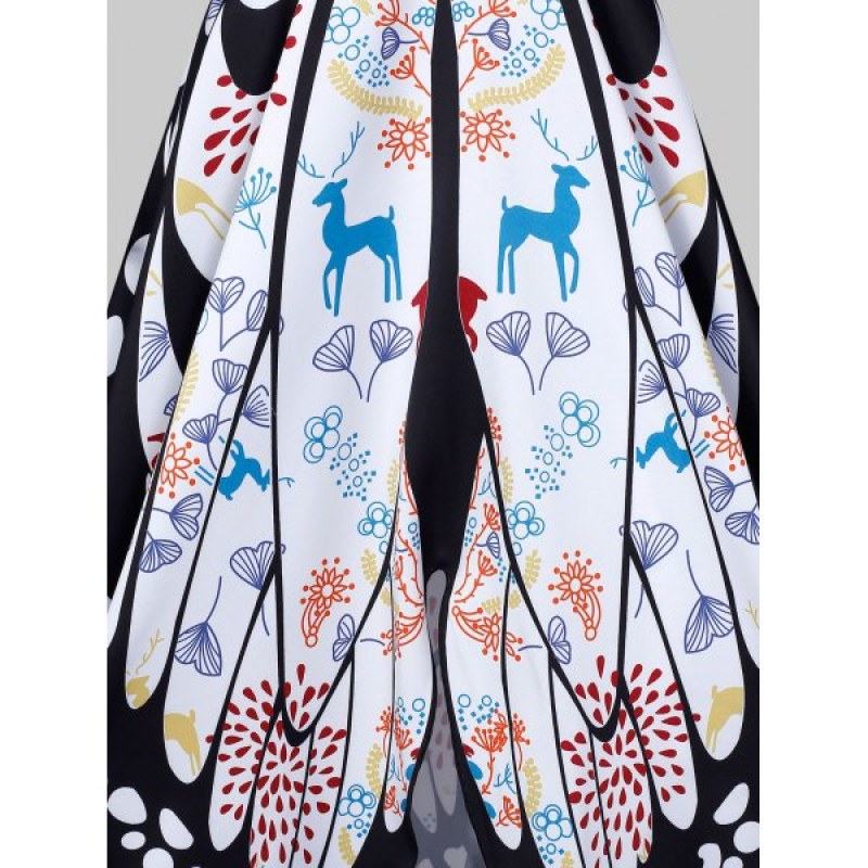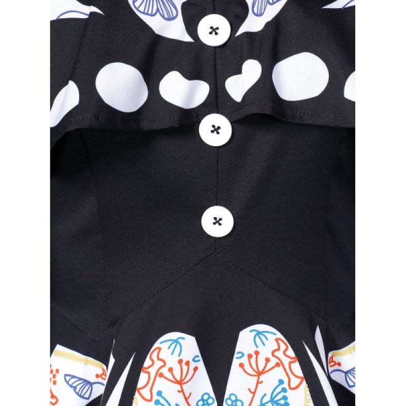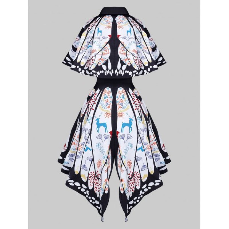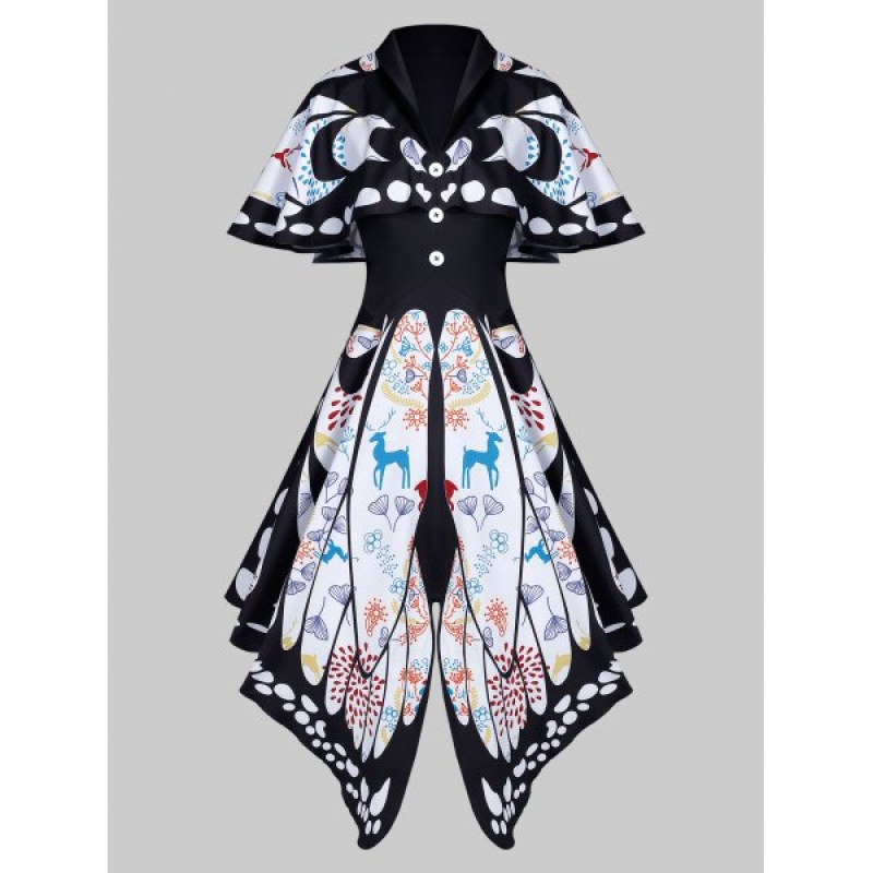 Shawl Collar Butterfly Print Buttoned Asymmetric Dress - White