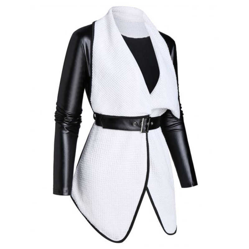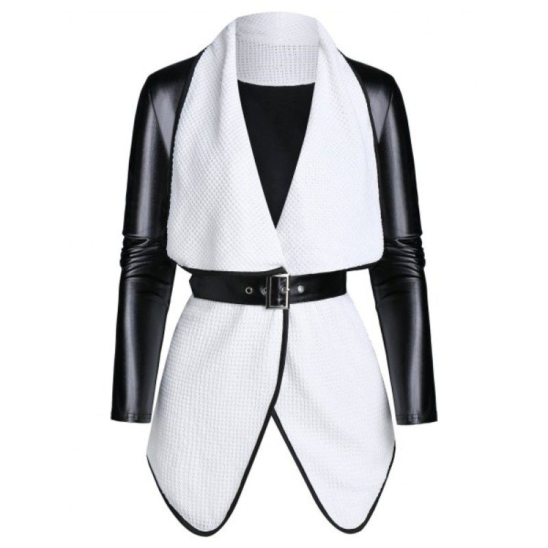 Long Sleeve Lapel Two Tone Jacket with Belt - Black