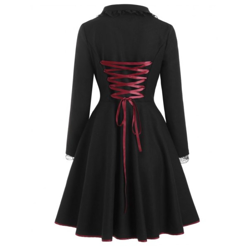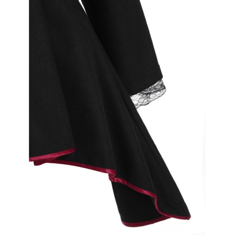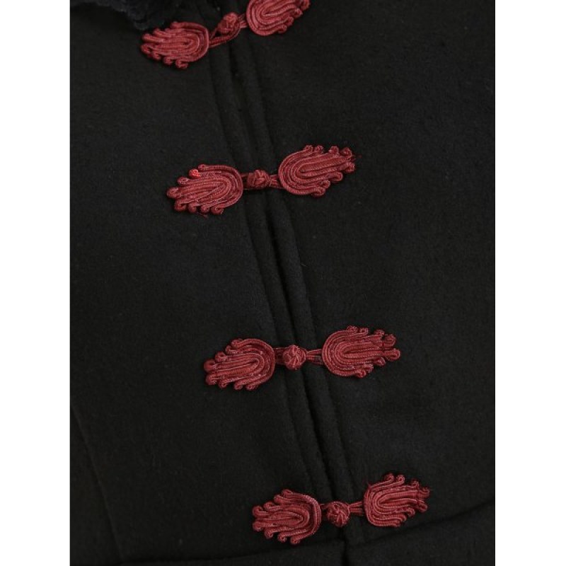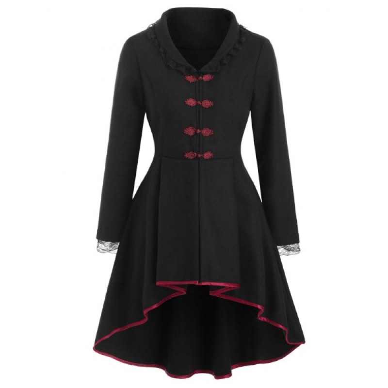 Laced Lace-up Frog Button Wool Blend High Low Coat - Black