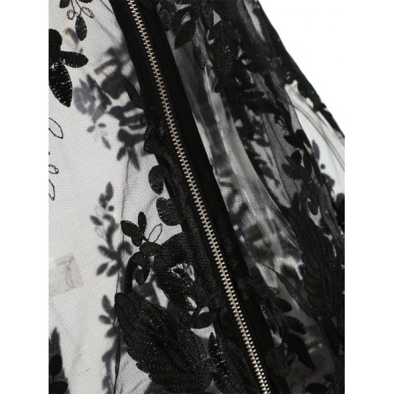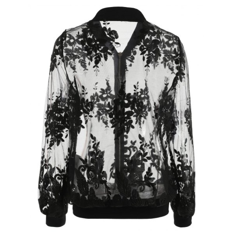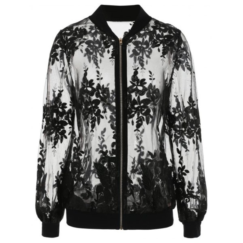 In a sheer black mesh fabric with embroidered detailing this bomber jacket is killer. It features a silver zip front and ribbed collar. hem and cuffs. Throw on over a bracelet and some denim shorts for on-point style vibes.