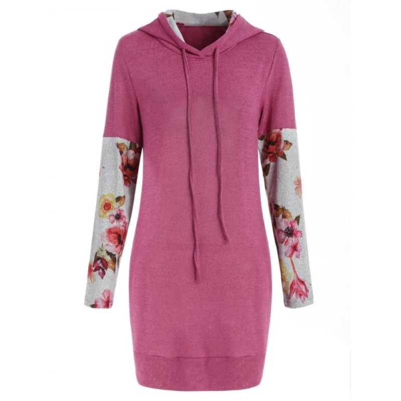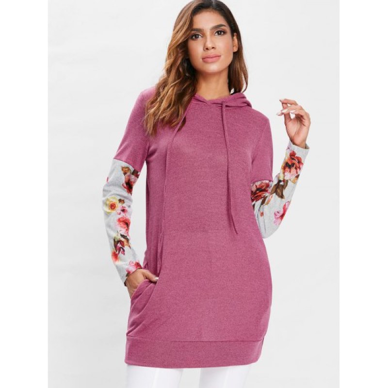 Floral Long Sleeve Drawstring Hoodie - Pink