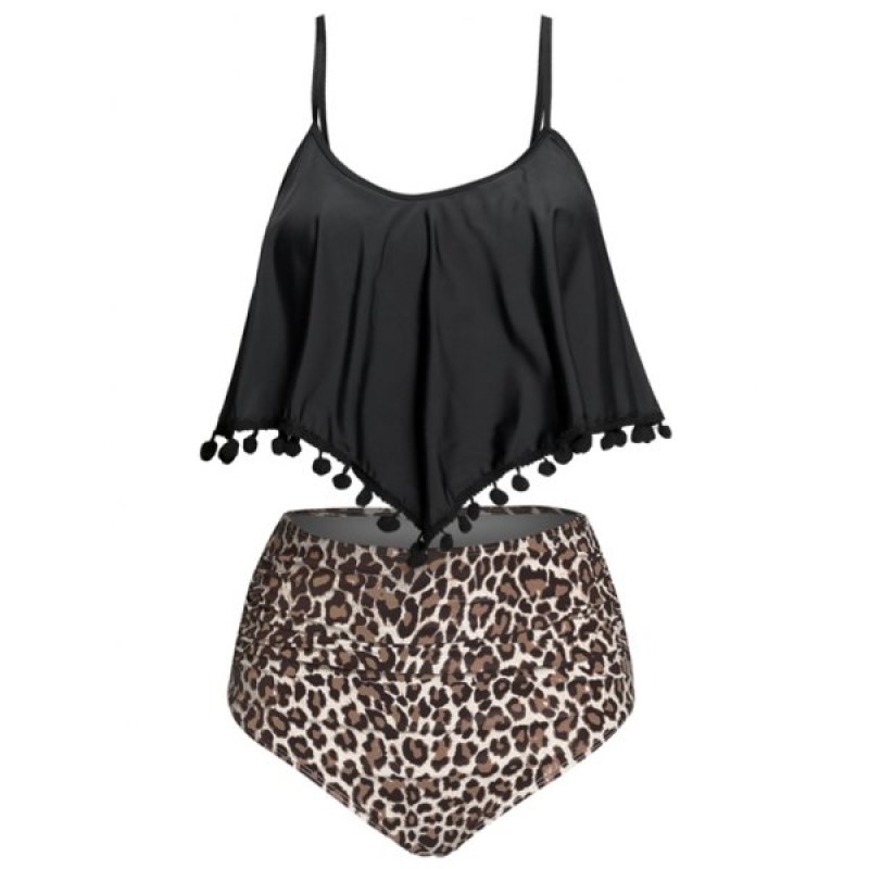 Mix and Match High Waist Overlay Leopard Tankini - Black