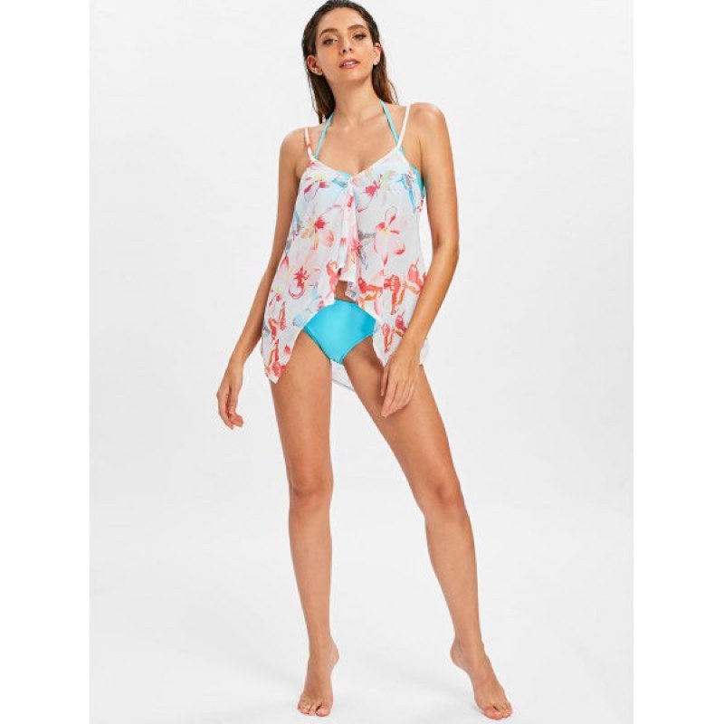 The bikini set features a solid color bra with adjustable halter straps and back ties. matching with mid-rise briefs for moderate coverage. The allover flower print cover-up features adjustable thin straps that form sexy v front and back. front slit that creates drape flowy silhouette. and long asymmetrical hem provides full coverage.