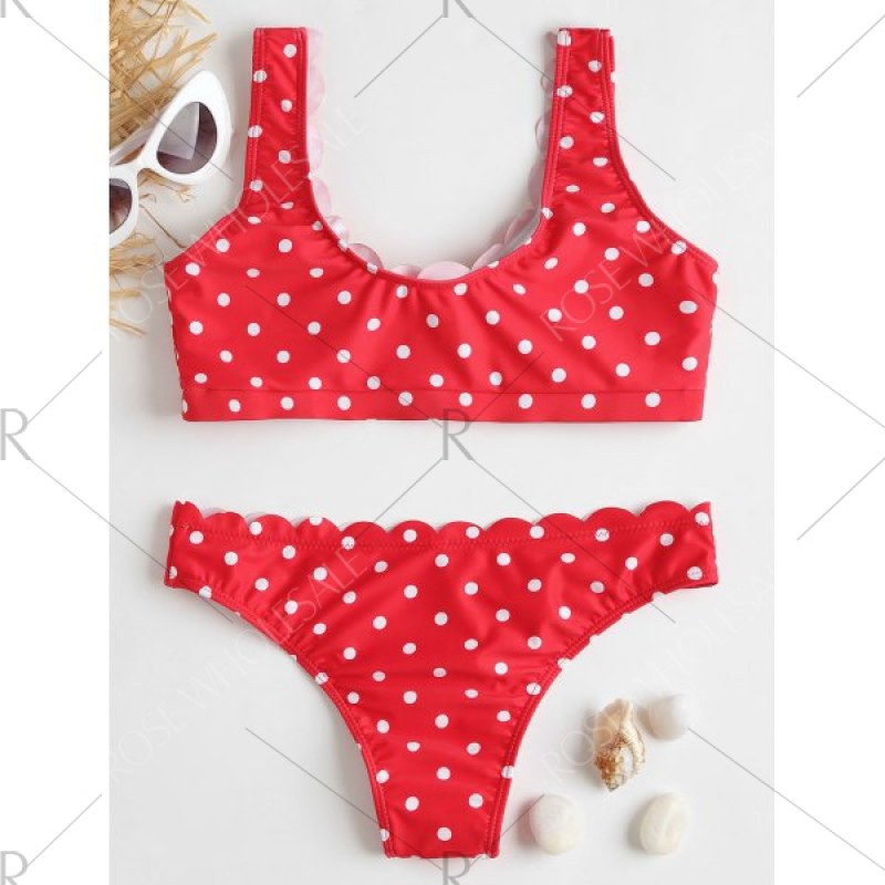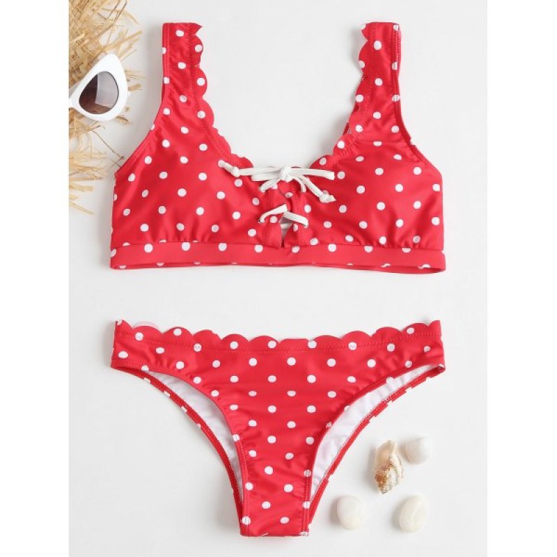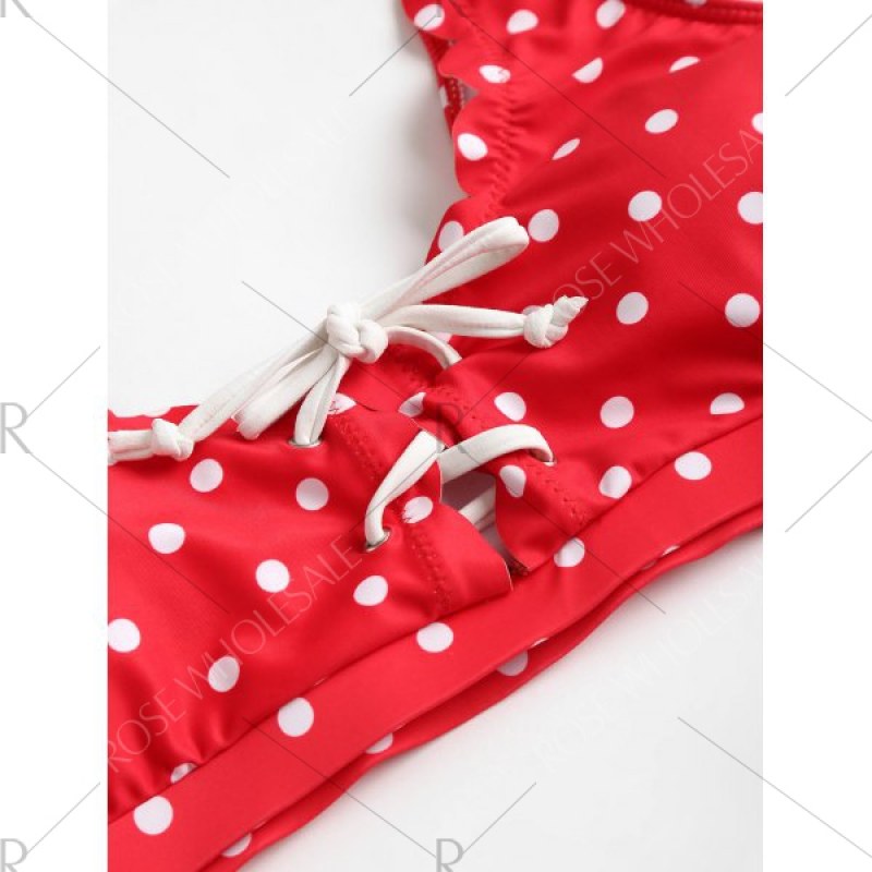 Just when you thought a day in the sun couldn't get any more fun. along comes this polka dot piece that's ready to shake things up. This style looks chic with scalloped edges and allover polka dot pattern. The bra top features adjustable lace-up detail on the front and has sponge pads for lightly support. It is a great swimsuit to color your summer beach styling.