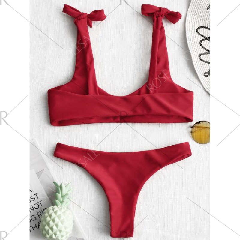 There's so much to love about this solid bikini and keep it simple during your beach holiday. The bikini swimsuit includes a sexy U neck top with self tied knot shoulder straps and a super flirty thong briefs. No underwire. but round sponge pads.
