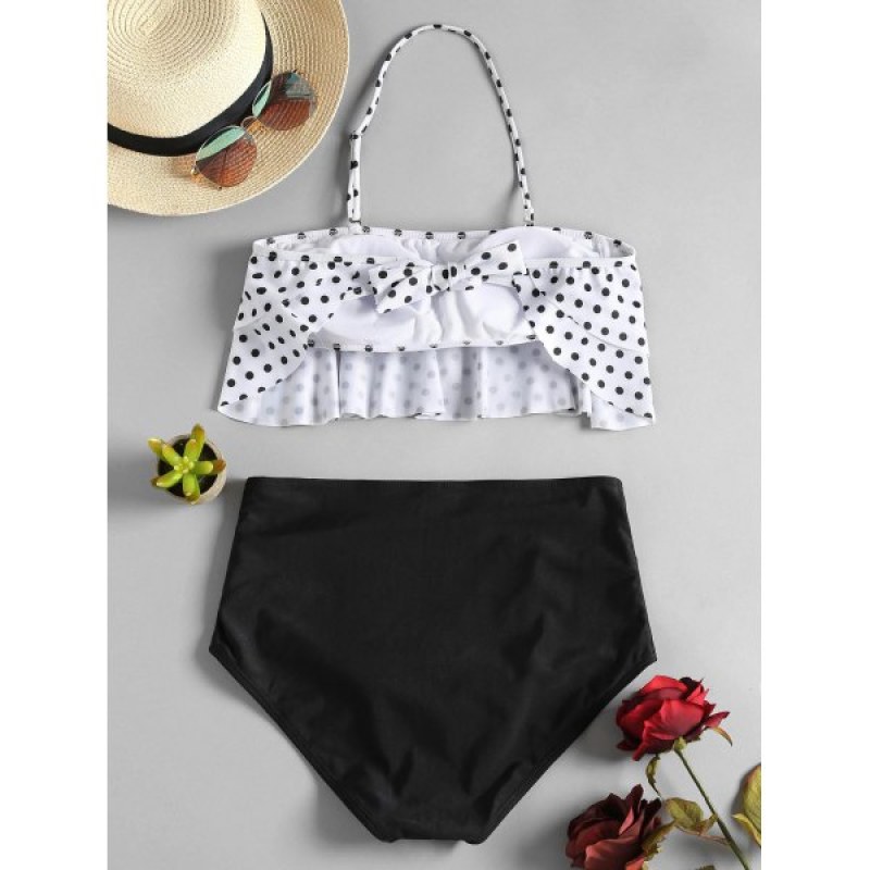 Adorable retro plus trendy contrast fashion. this bikini style is ready for a day full of beach blankets and boards. The tiered flounce bra top is crafted from allover tiny polka dots and an adjustable knot closure at back. A removable halter strap is included that enables it to be worn as a bandeau style. Matching with a pair of solid briefs with ruched design to complete the look.
