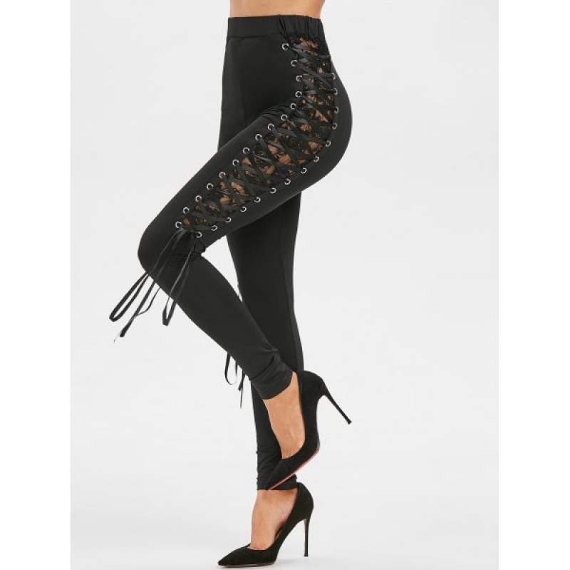 High Waist Lace Up Punk Pants - Black