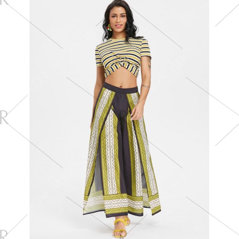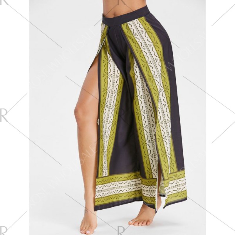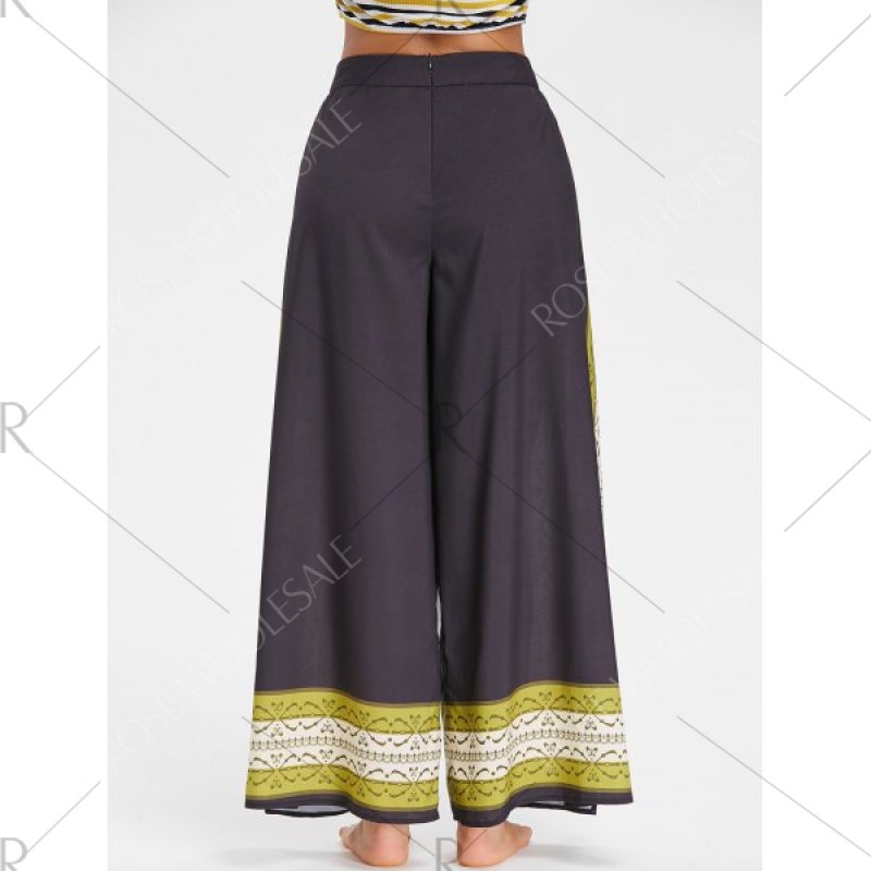Shake up your wardrobe with wide-leg pants in sweet tribal print that perfectly mirrors the sexy high slit that runs down both sides. Subtle overlay detail. High waist with hidden back zip closure. Style with a striped crop top for a chic and fresh summer look.
