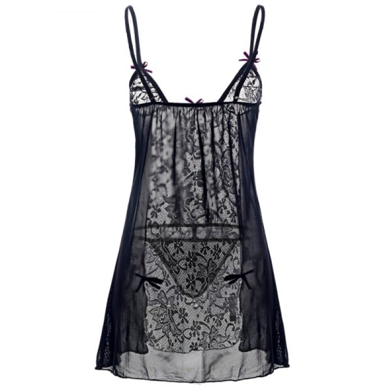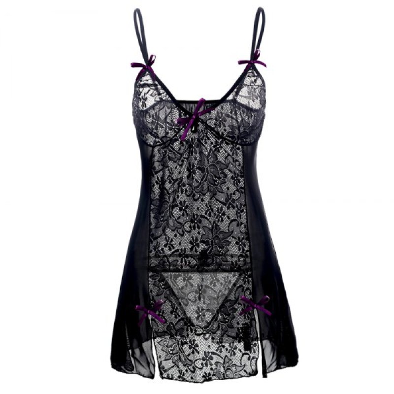 Women exy houlder trap Bowknot Plus ize Babydoll Lingeries leepdress - Black