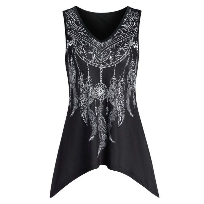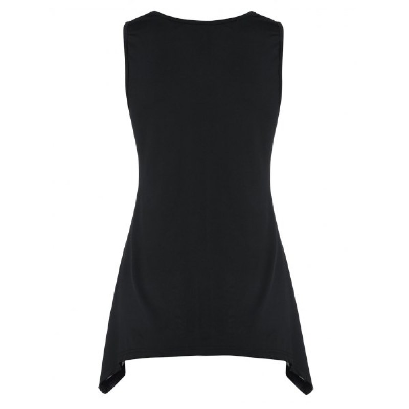 Asymmetrical V Neck Printed Tank Top - Black