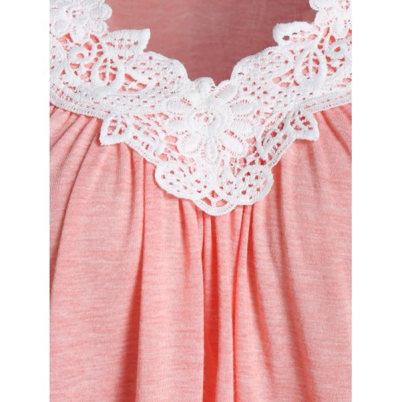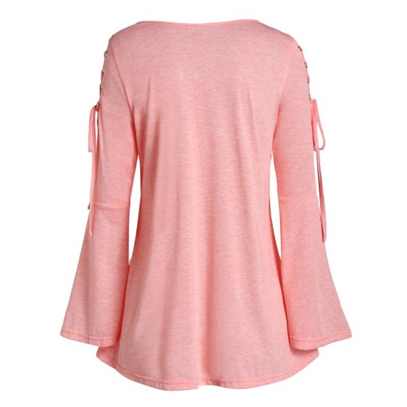 Contrast Lace Lace Up Bell Sleeve T-shirt - Pink