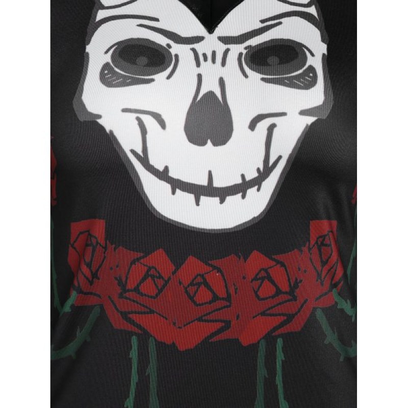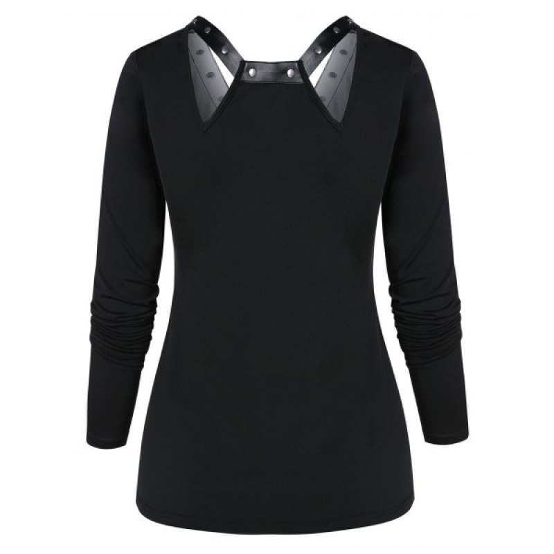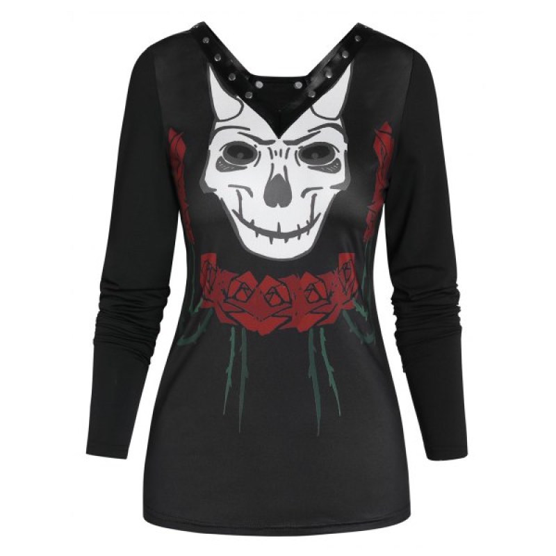 V Neck Long Sleeve Printed T Shirt - Black