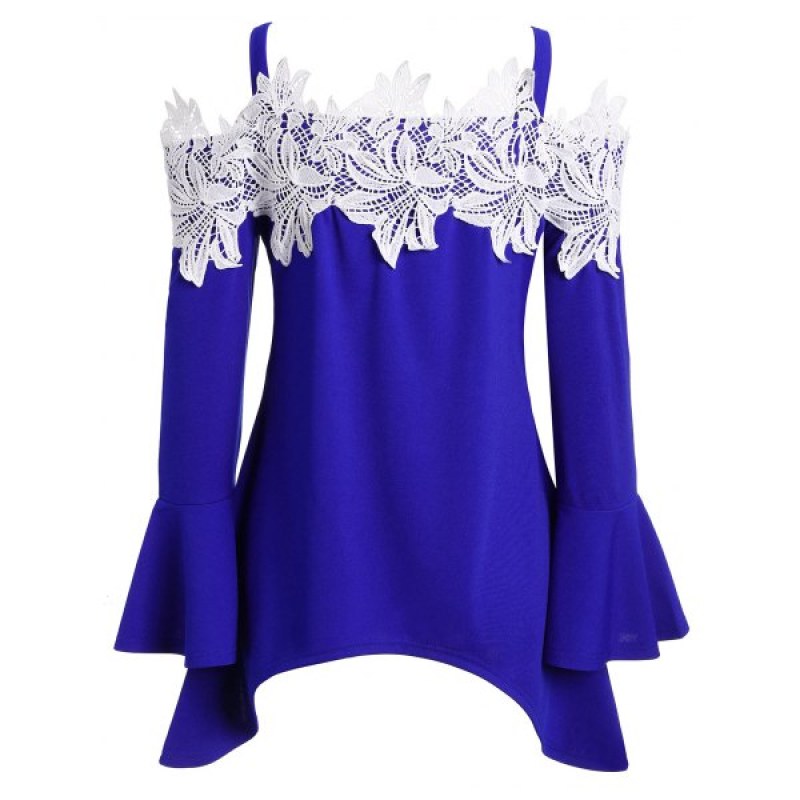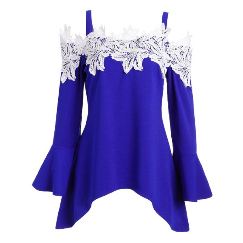 Cold shoulder design complete with delicate lace accents. This long sleeve top for new season must be the next fashion trend icon. It has square neckline. beautiful floral lace trim around neck. long bell sleeves. and asymmetrical hem.