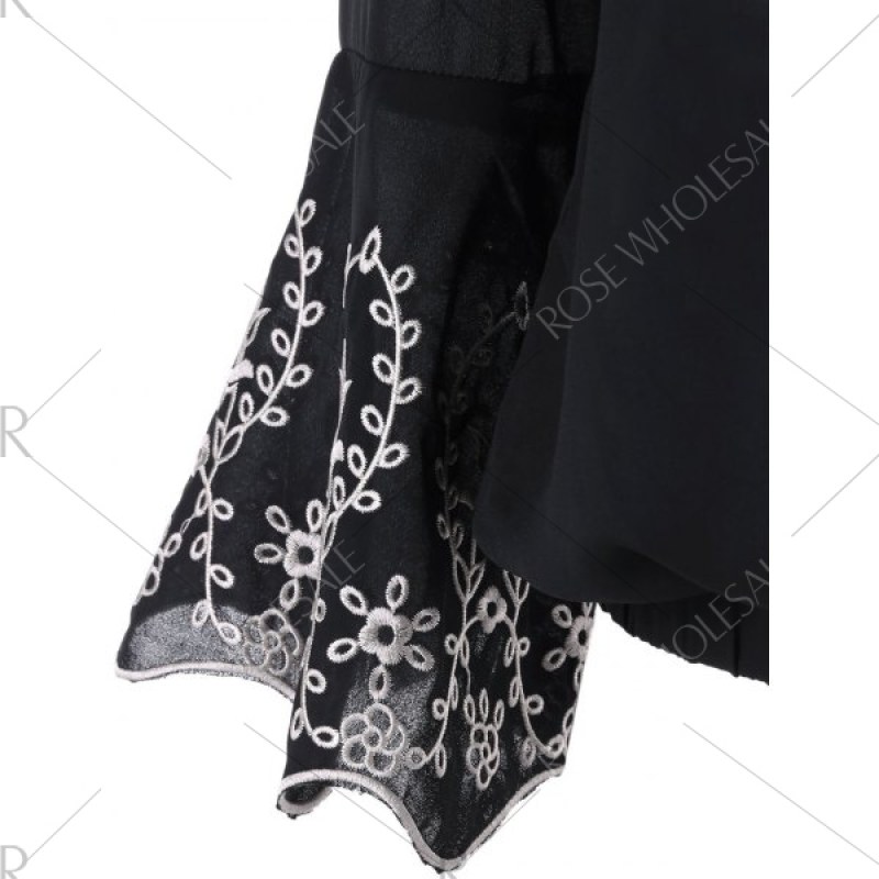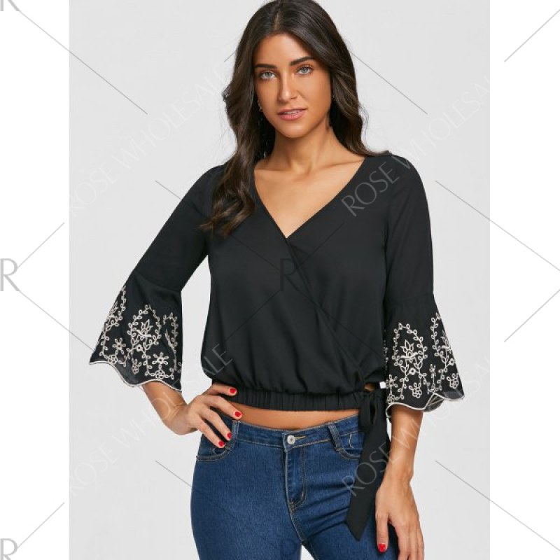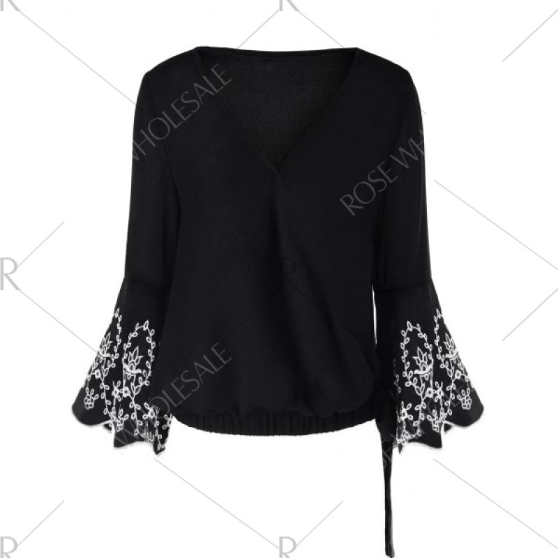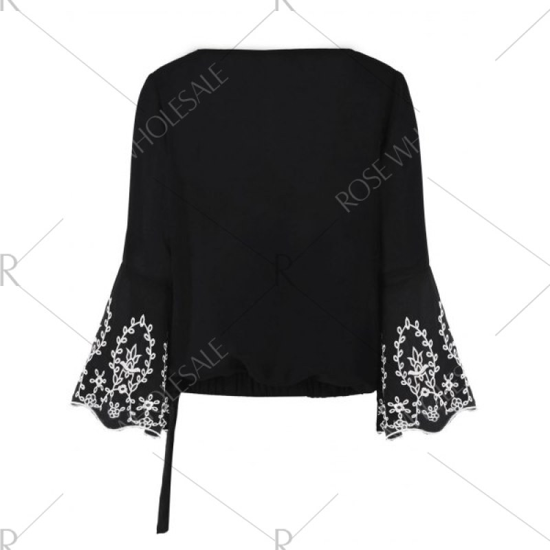 V Neck Flare Sleeve Embroidery Blouse - Black