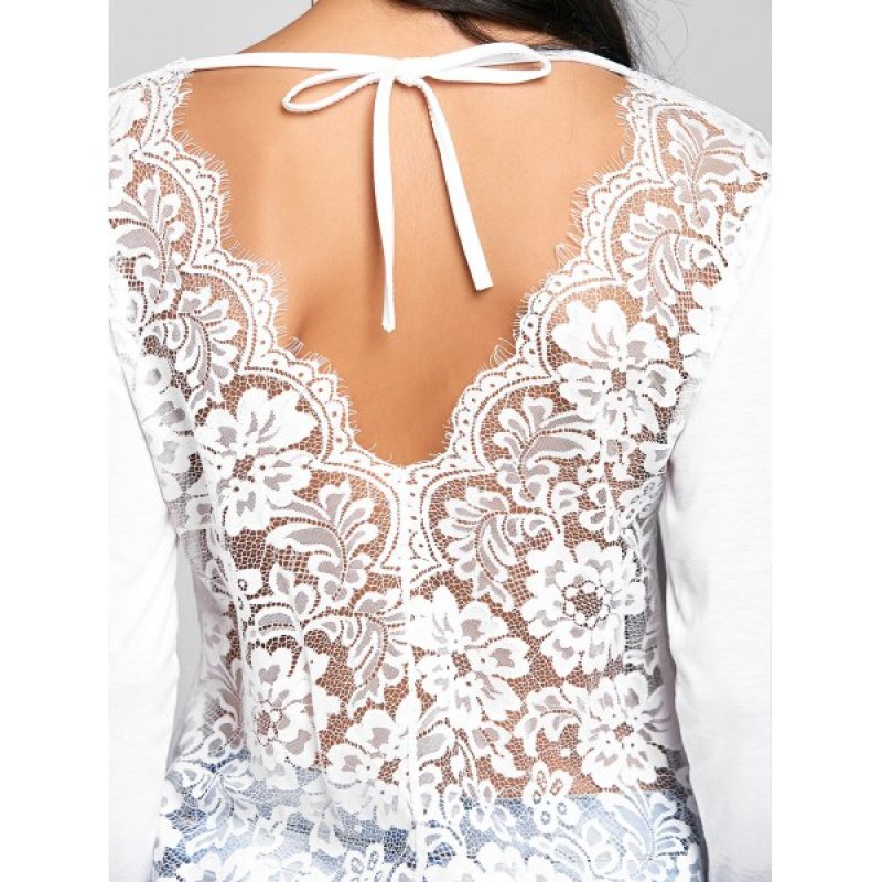 This tee is simply an essential for all of your spring and summer adventures! Featuring a V-shaped cutout with self tie closure at the back neck. it's simply a stunning look! Sheer lace Insert along the back adds even more beauty to this look. Rock this tee with distressed jeans for a chic look!
