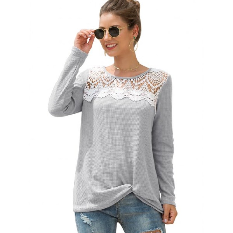 Knitted Crochet Panel Twist Long Sleeve Tee - Gray