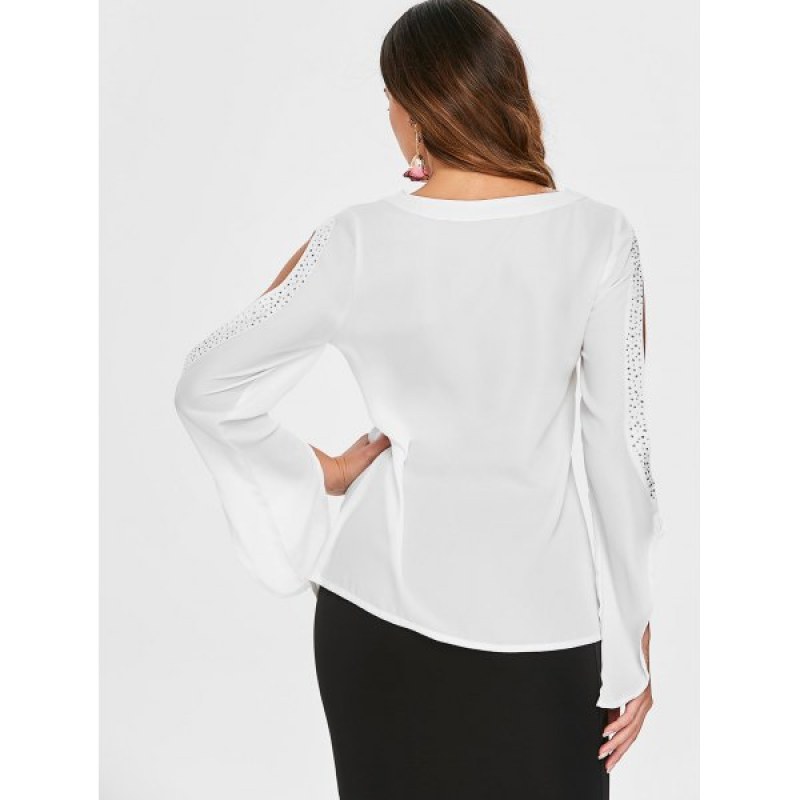 Cut Out Sleeve Rhinestones Brim Blouse - White