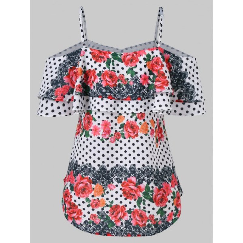A double-deck floaty flouncy design imparts breezy romance and retro feel to an on-trend. cold-shoulder blouse which has a sweet flower and classical polka dot pattern.