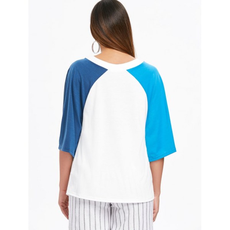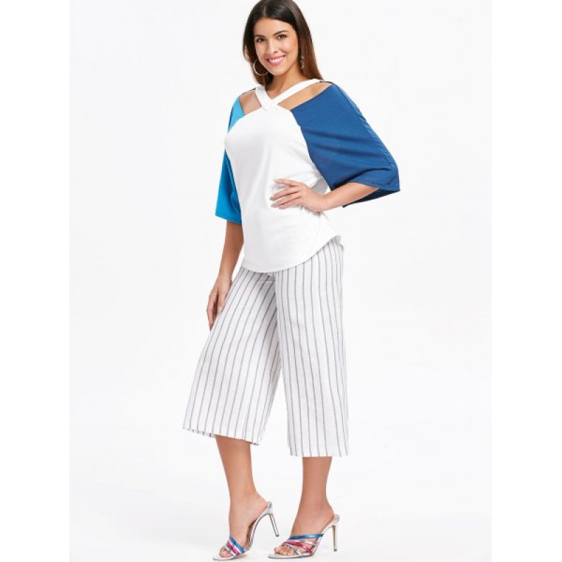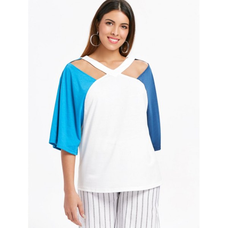 Color block sleeve and cut out detail at the front adds a ladylike update to this on-trend T-shirt. And the V-neckline shows off your sexy clavicle. Just styling it with jeans or denim shorts to complete the breezy and flirty look.