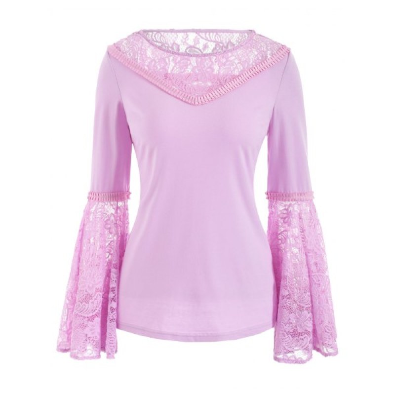 Sweet T-shirt in an easy and lightweight fabric features a pastel mauve color. femme round neck. alluring lace insert and long sleeves with fluttering bell-shaped lace cuffs for an ultra cool. edgy feel. Back lace-up detail creates a chic touch. Pair it with pants to complete this chic look!