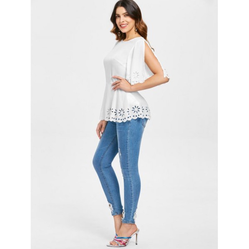 This casual blouse in solid color comes with a casual round neckline. a delicate laser-cut pattern and flattering split sleeves. as well as an alluring peplum design which shows your charming waist.