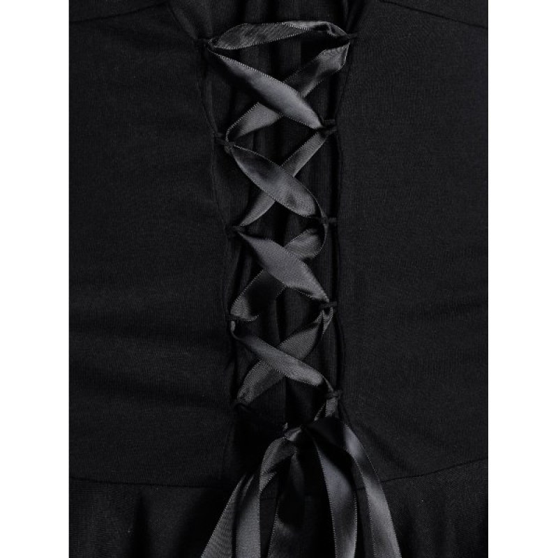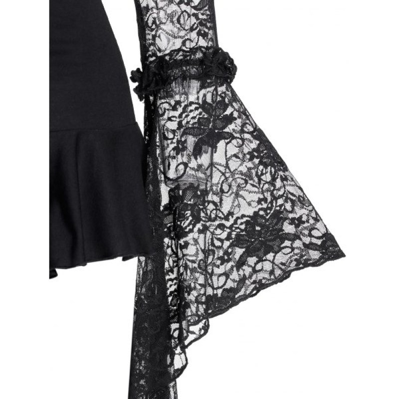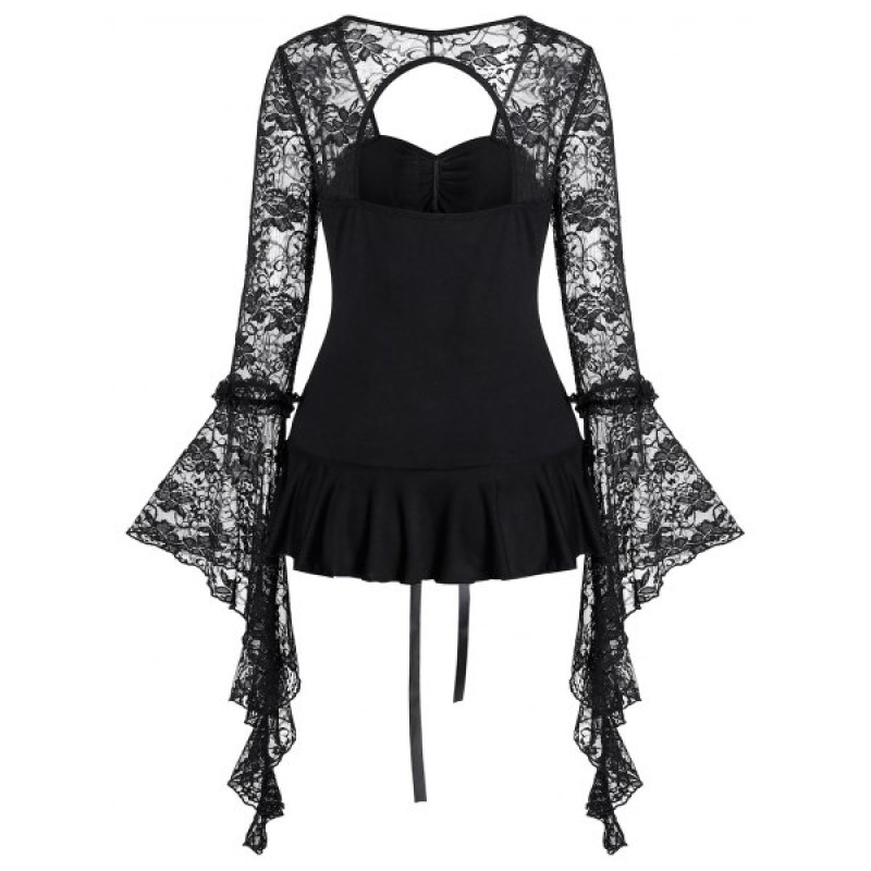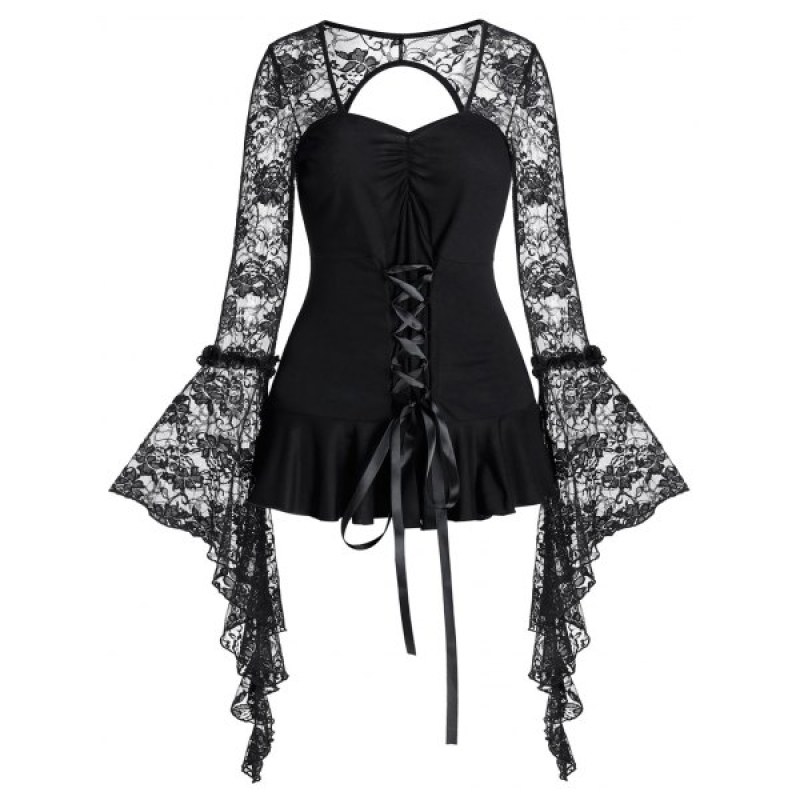 Lace Up Bell Sleeve Lace Sheer Gothic Flounce Cutout Tee - Night