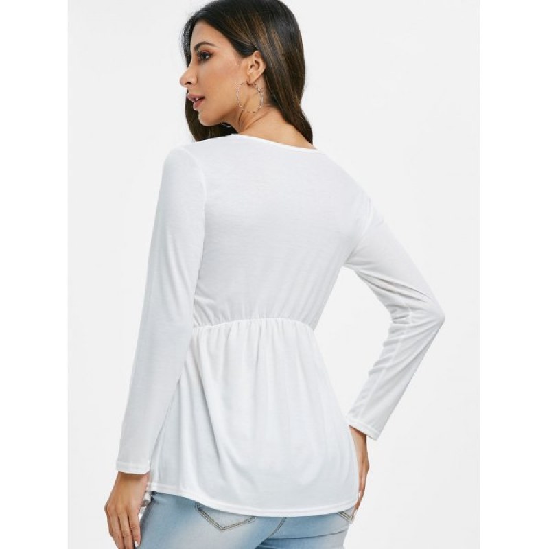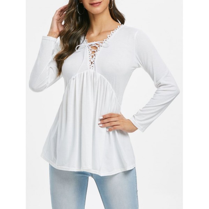 Lace Trim Lace-up Long leeve Top - White